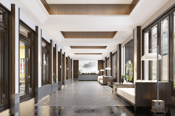 酒店大廳設(shè)計摒棄繁瑣的裝飾,用純色和木色結(jié)合,表現(xiàn)了古典與現(xiàn)代相結(jié)合的靜謐之美。展廳設(shè)計采用對稱美,隨處可見的藝術(shù)品,使整個空間充滿了年代和藝術(shù)感。