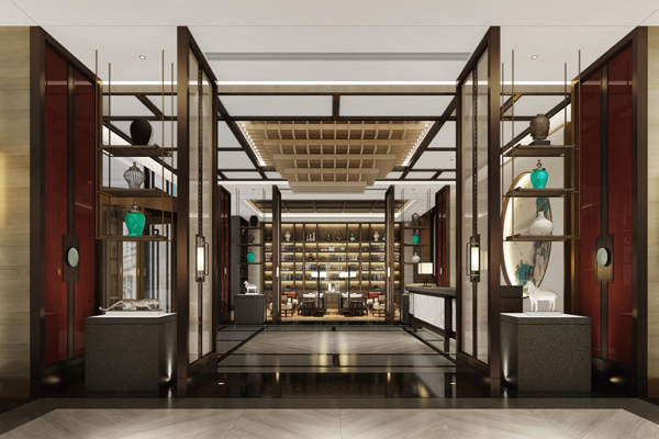 中式燈具、藝術(shù)書籍、藝術(shù)陶瓷擺件,賦予空間更具藝術(shù)感。餐廳通過區(qū)域靈活組合劃分,搭配出不同座位的組合方式,滿足不同客群的用餐需求。重構(gòu)了空間的頂部線條,與屏風(fēng)夾絲玻璃的線條交錯呼應(yīng),獨(dú)特的型態(tài)與寓意運(yùn)用在設(shè)計元素中,為享用美食的時光再添意趣。傳統(tǒng)東方紅的紅色墻面,在青灰色調(diào)中增添了一抹亮色充滿生機(jī)。