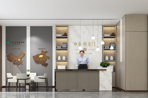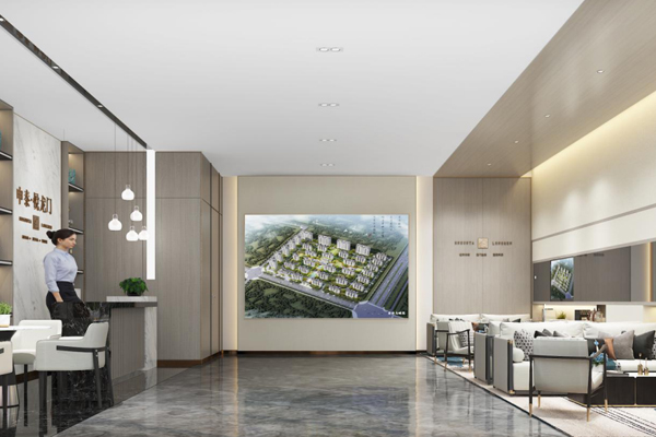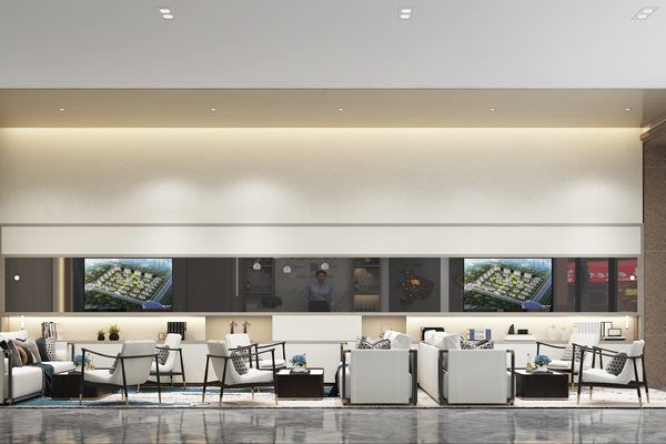 進(jìn)入售樓部大廳,立面墻面的木飾面與洽談區(qū)頂部的木飾面將人們引入一個(gè)開闊、舒適的氛圍。整體售樓部設(shè)計(jì)以灰、大地色為主,搭配米色布藝家具,簡(jiǎn)潔的線條,營(yíng)造一個(gè)現(xiàn)代簡(jiǎn)約的展示空間。