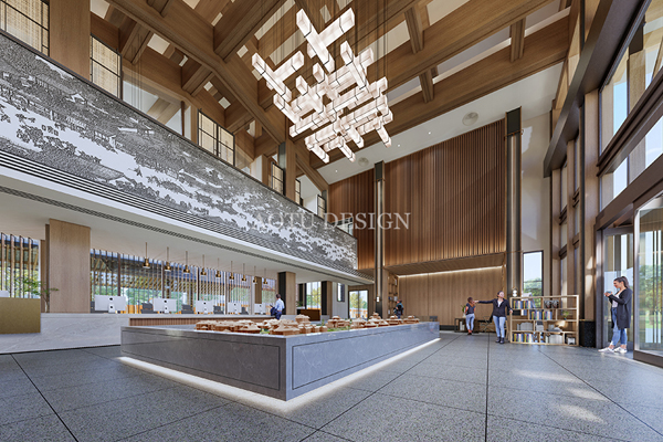 整體游客接待中心設計定位依托宋朝文化,探尋當代生活方式,打造理想歸園田居的生活方式。接待大廳天花設計的高低差搭配陣列,讓無序的空間層次感與序列感。凹凸設計團隊結合開封特色將清明上河園部分圖設計在二樓走廊圍墻上。去繁留簡,設計盡可能通過材質、工藝本身的特點營造氛圍。