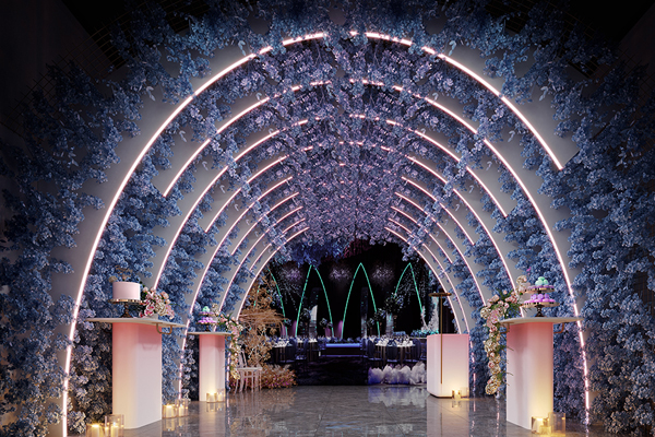 婚宴宴會(huì)廳設(shè)計(jì)以唯美花海作為設(shè)計(jì)主題,入口處拱形序列造型營(yíng)造滿滿的序列感和儀式感,大廳則以現(xiàn)代框架結(jié)構(gòu)結(jié)合定制花藝,打造美輪美奐的視覺空間。
