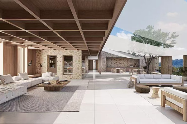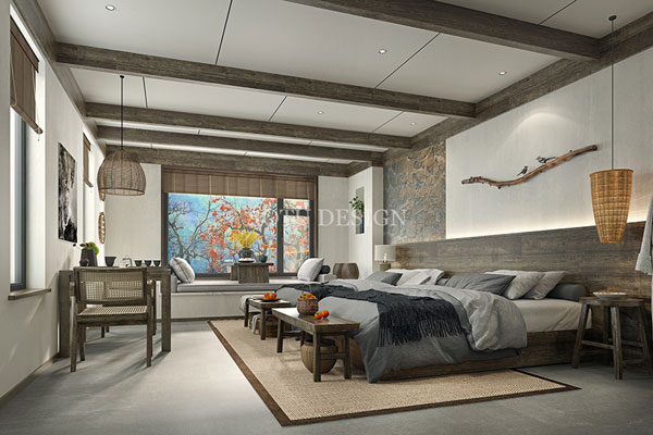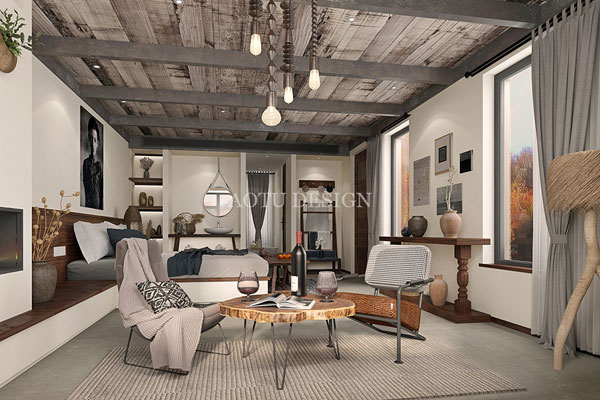 設(shè)計呼應(yīng)傳統(tǒng)木質(zhì)結(jié)構(gòu)建筑頂層,在空間中利用軟裝陳設(shè)的旋變、疊加、交錯的體塊帶來視覺上的多維立體感,豐富著空間的表達(dá),彰顯自然主題的柔和性與舒適度。