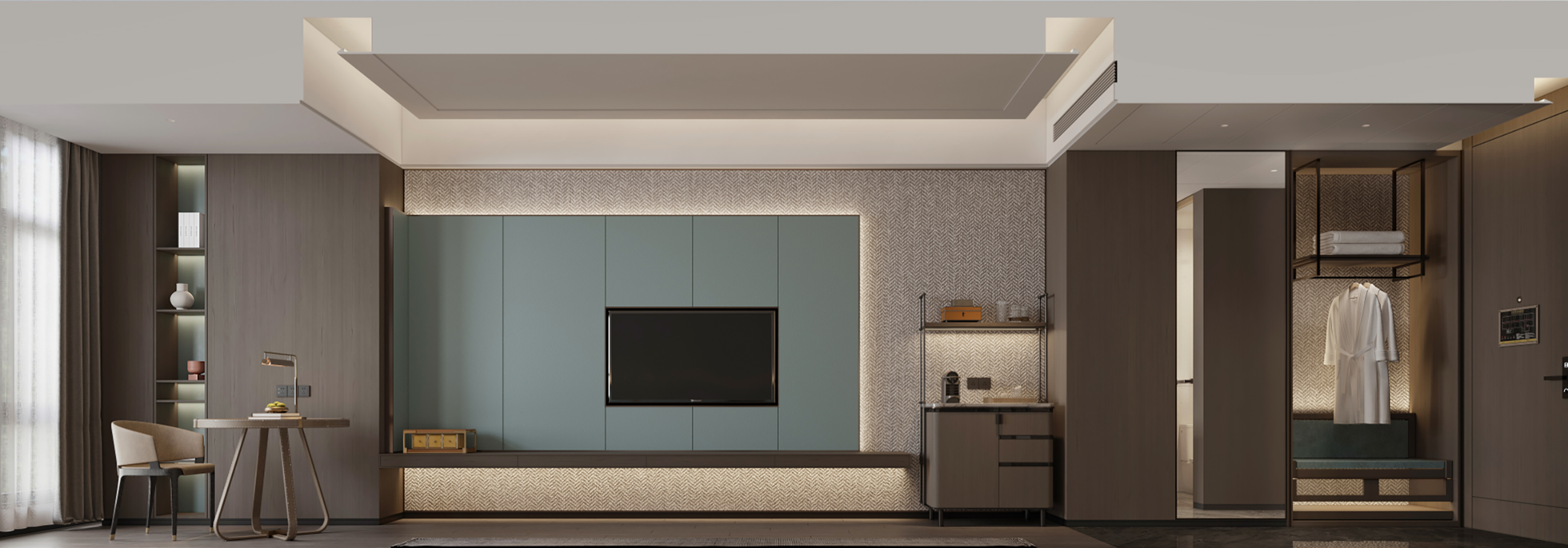 裝飾以灰色原木作為基調(diào),搭配了深淺灰度的綠色軟包及城市文化脈絡(luò)的裝飾。色溫潤(rùn)質(zhì)感,讓人心境沉淀沉靜,舒適悠閑氛圍,就像回到家一樣輕松自在。